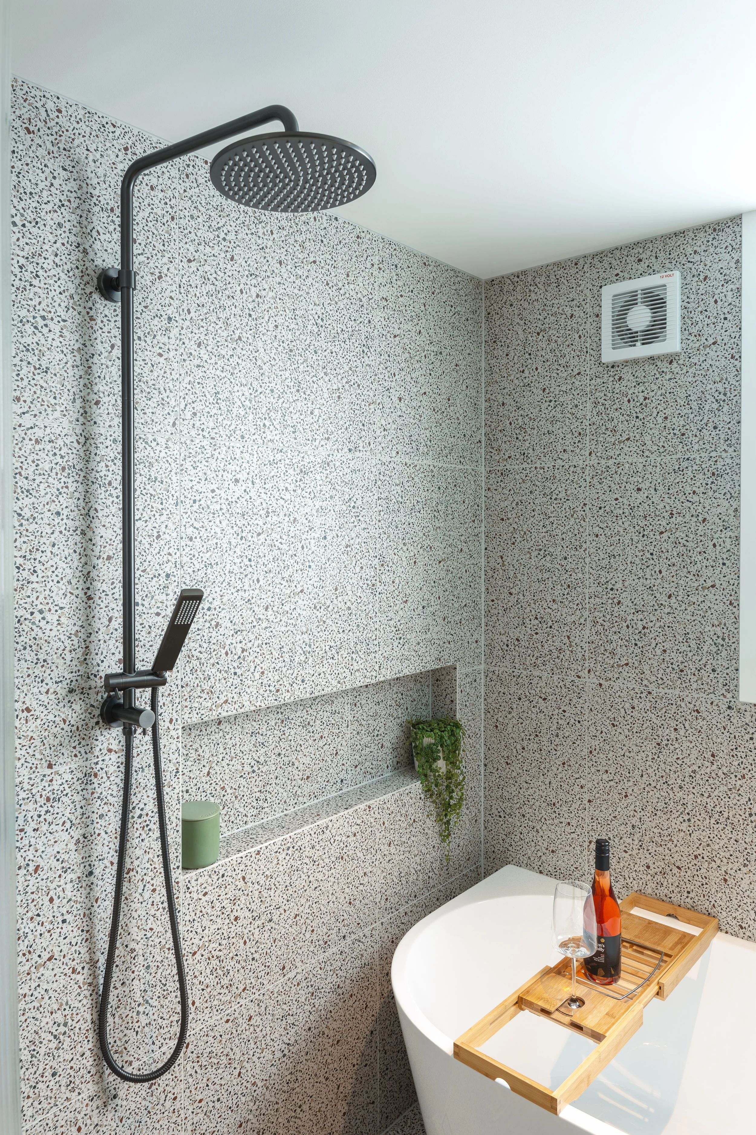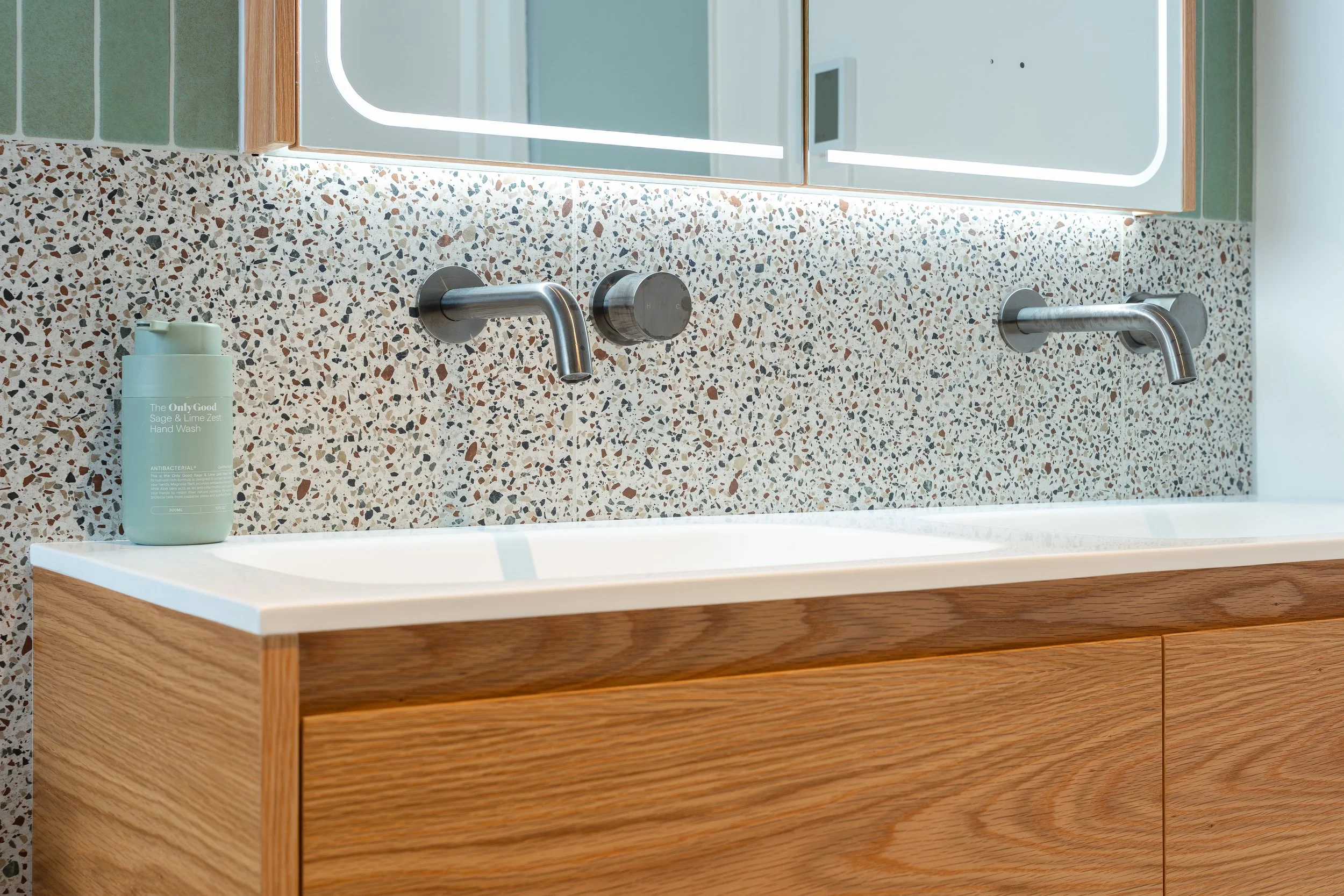 Chroma Interiors transformed this Devonport bathroom into a fresh, functional retreat. The bathtub now sits beneath the window, a spacious walk-in shower was added, and a double vanity serves the couple perfectly. Terrazzo floors meet green subway walls for a fun, lively feel, while the oak vanity adds warmth and texture. The result is a bathroom that’s modern, inviting, and full of personality.